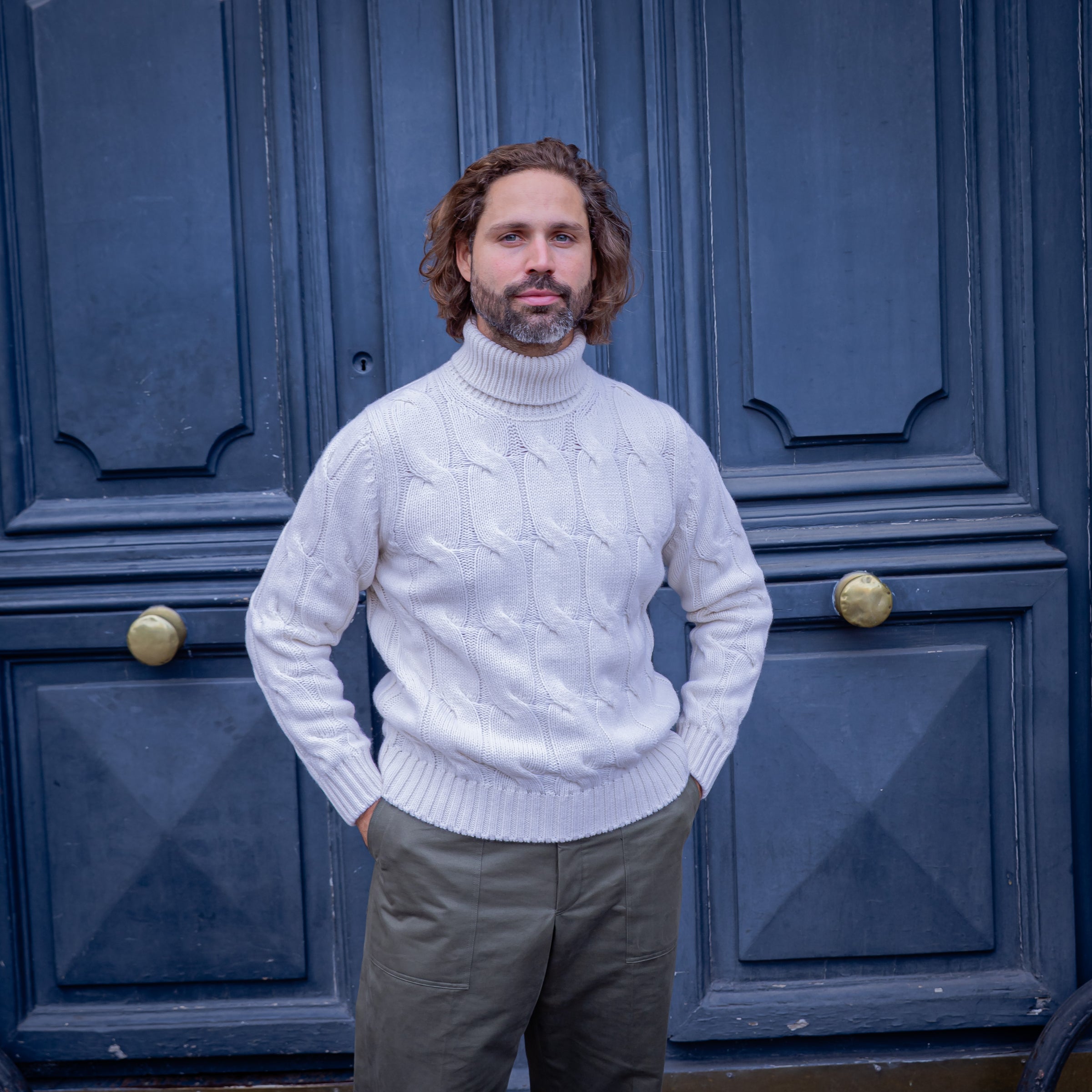 Pull col roulé torsadé laine et cachemire blanc cassé