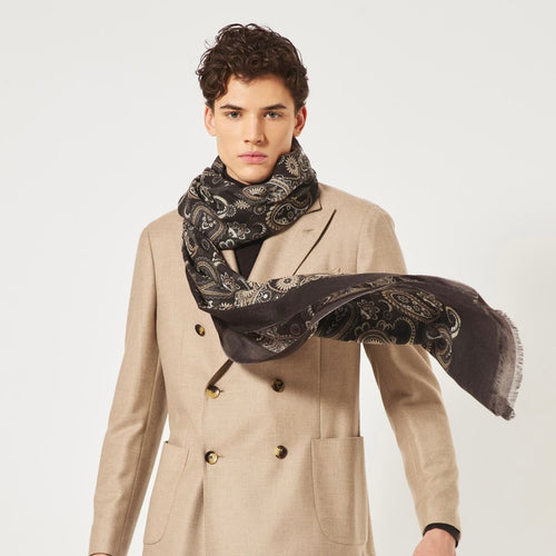Écharpe voile de cachemire gris motifs losange et cercle