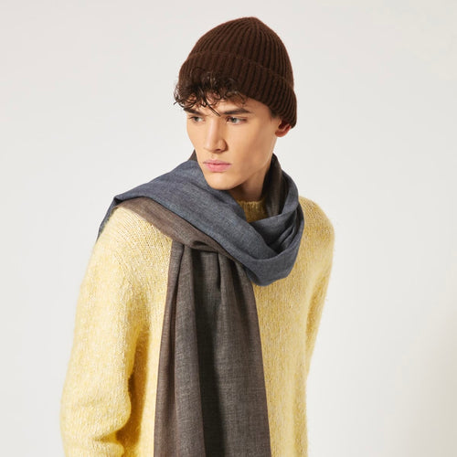 Écharpe double face bleu denim/marron chocolat voile de cachemire