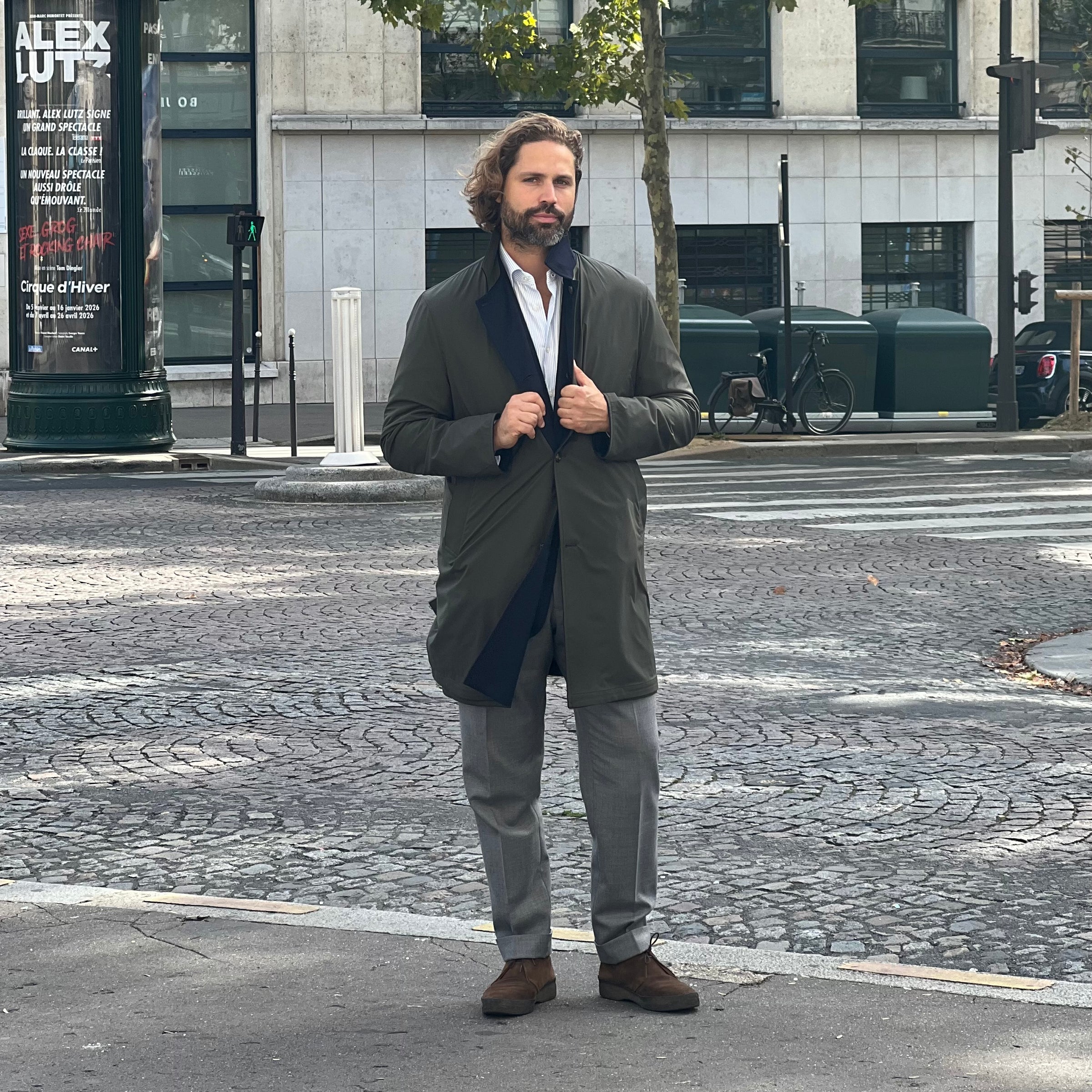 Un côté 100% cachemire bleu marine Carlo Barbera, l’autre côté en microfibre imperméable Storm System Loro Piana vert